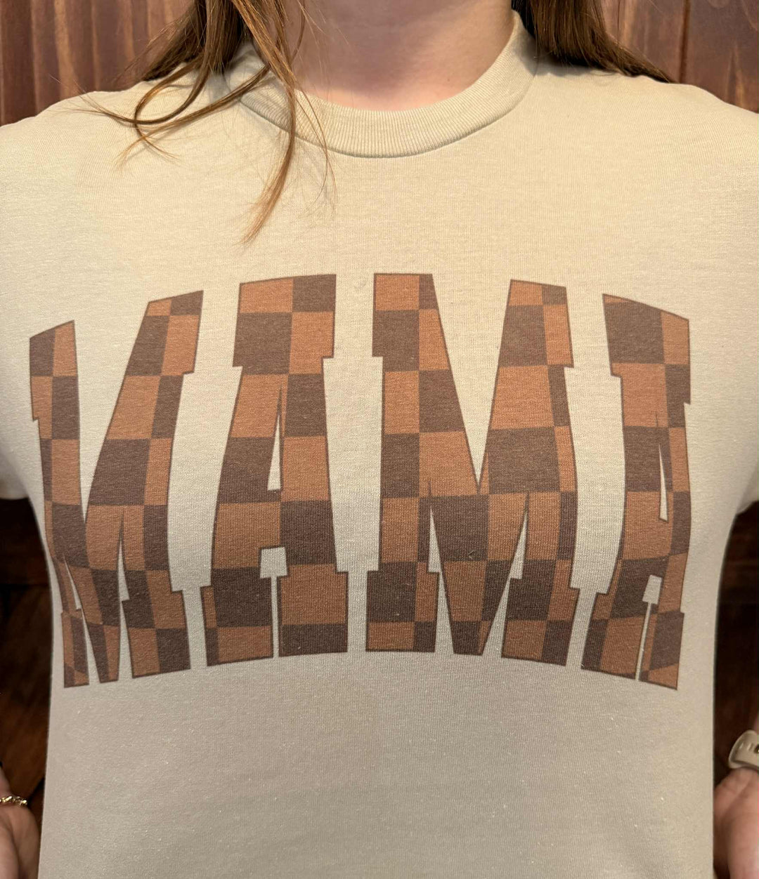 BROWN CHECKERED MAMA GRAPHIC T-SHIRT