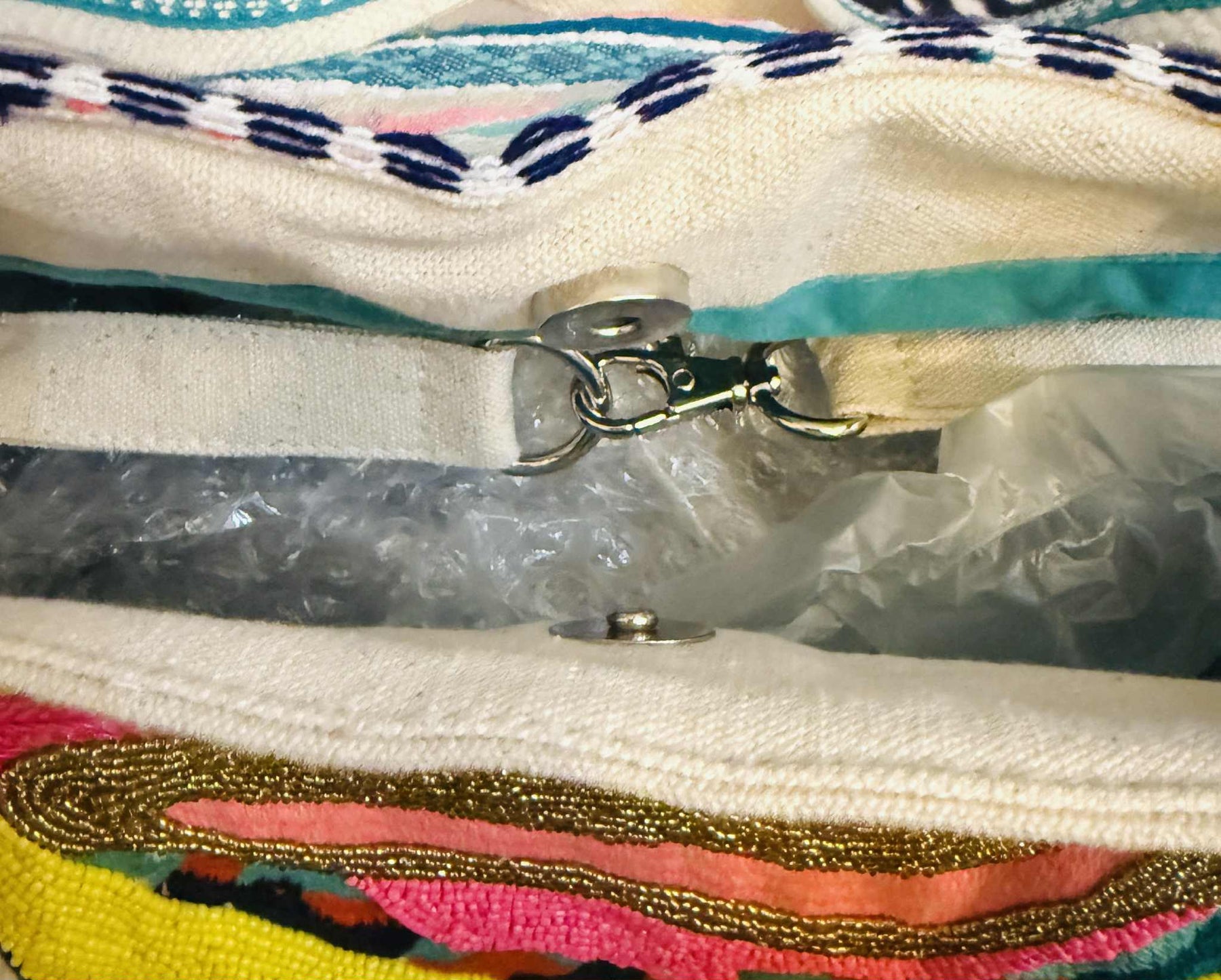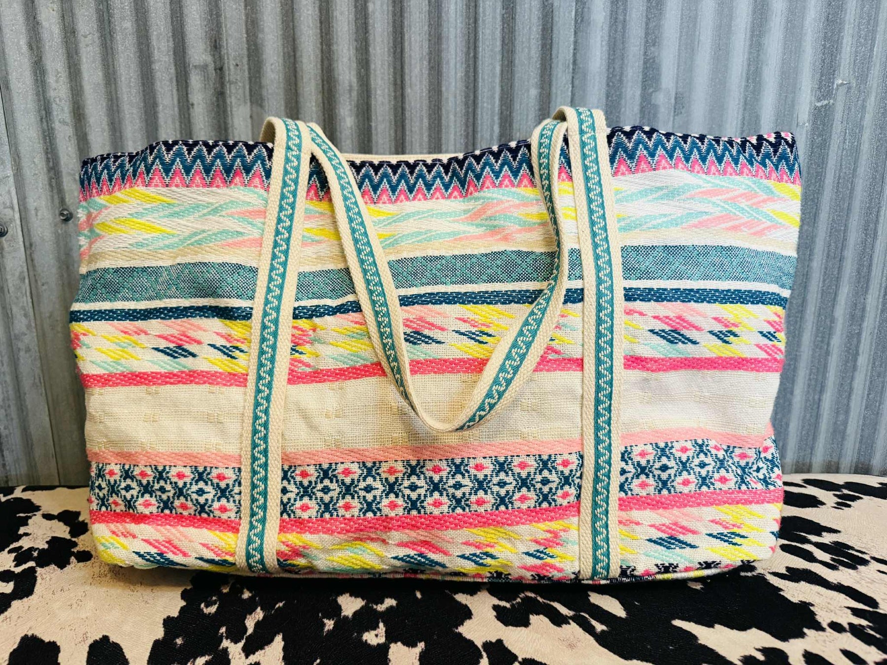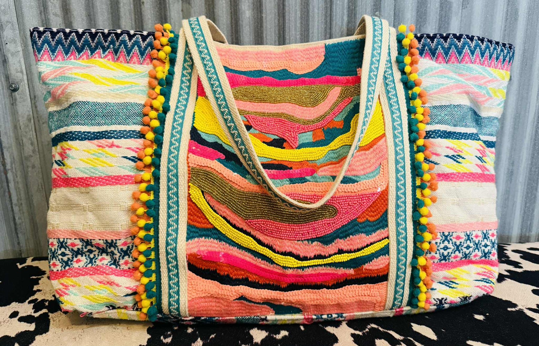 Pack your weekend essentials in style with the Neon Summer Weekender. This vibrant bag features a charming mini pom pom garland trim and intricate beaded design that turns heads wherever you go. The spacious interior gives you plenty of room for all your travel must-haves, while dual closure options—choose between secure clasps or a convenient magnetic button—keep everything safely contained. Perfect for quick getaways or spontaneous adventures.