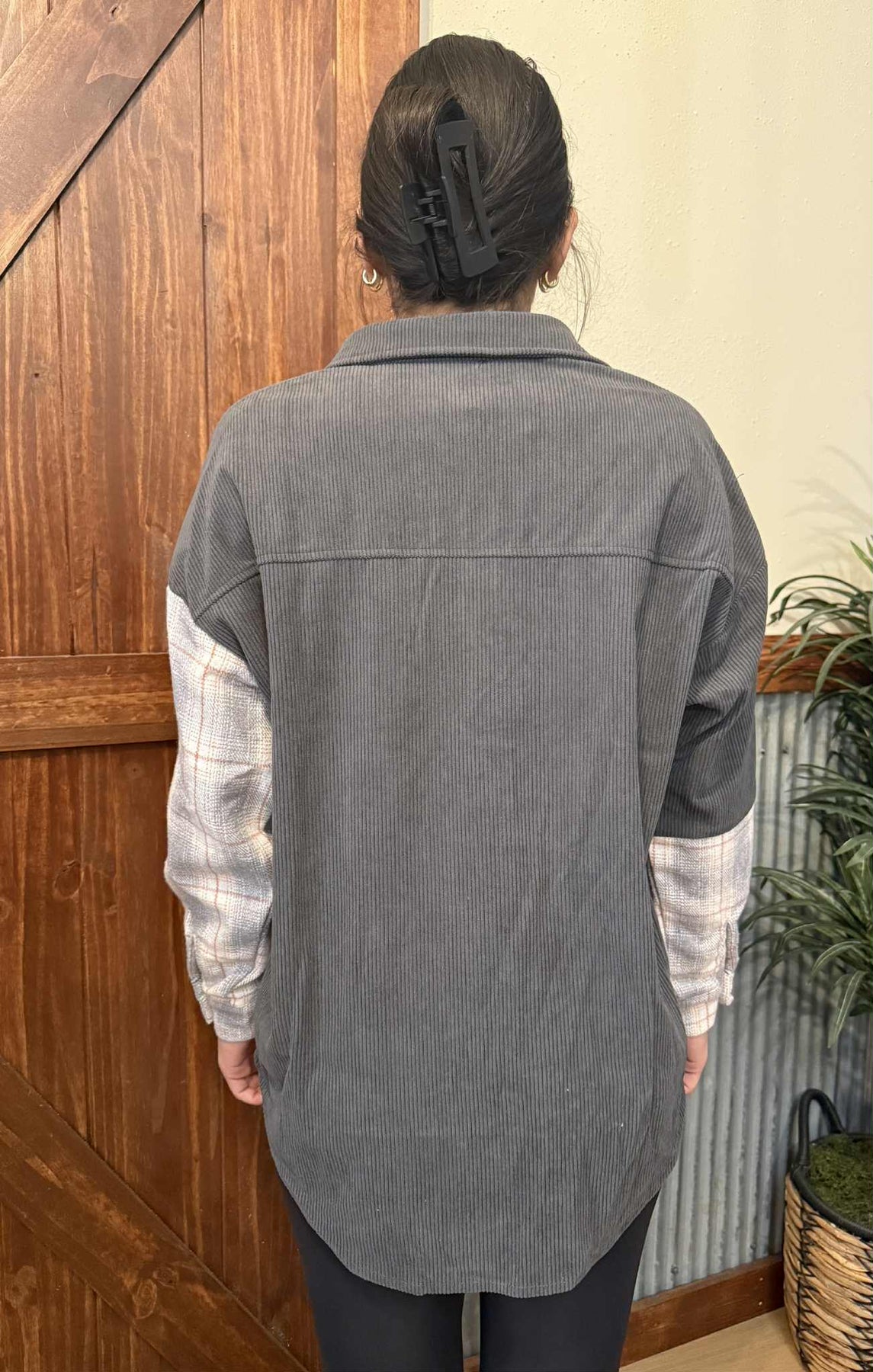 Tough decisions just got a whole lot cozier. This charcoal corduroy button-up features a charming half plaid design that strikes the perfect balance between laid-back and put-together. The soft, lightweight corduroy fabric makes it ideal for layering or wearing solo when the weather calls for something easy and effortless. Simple in style but big on personality, this piece is your new go-to for casual comfort that doesn't compromise on charm.